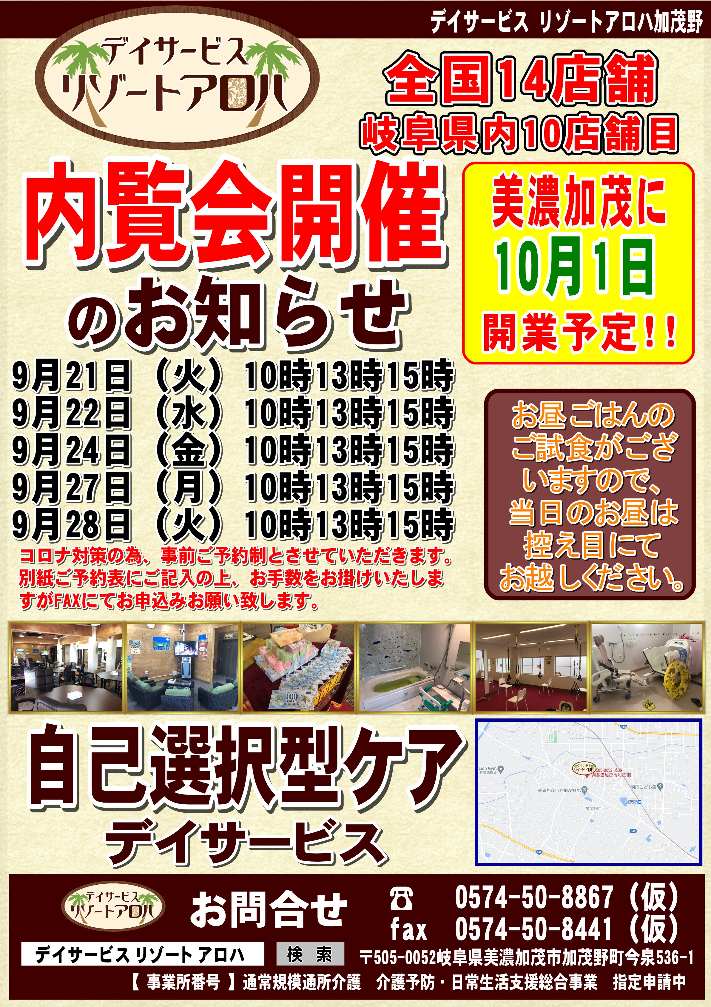 内覧会開催のお知らせ 2021.08.31 10月1日に開業予定のデイサービスリゾートアロハ加茂野の内覧会についてお知らせいたします。 アロハ可児、広見、多治見に続く直営4号店として、 美濃加茂市加茂野町今泉563-1にオープン致します。 つきましては9月21日(火)より内覧会を開催いたします。 内覧会は新型コロナウイルスの感染防止のために少人数・予約制にて行いますので、 ご予約、施設へのお問合せについて本HPのお問合せよりお願い致します。 Category: Author:aloha /index.php/blog/blog_comments/captcha /index.php/blog/blog_comments/get_token